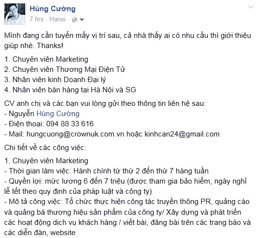tuyendungcrownuk Tháng Tư 14, 2015 Original Image size: 533 × 490 Nhờ hỗ trợ tuyển dụng 1 số vị trí về marketing, ecomercial, sale tại Hà Nội và SG