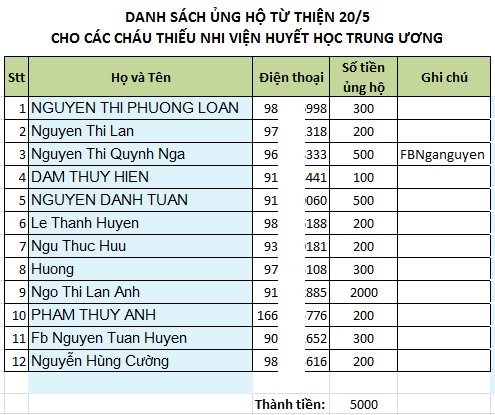 Cap nhat danh sach ung ho 150518 Tháng Năm 16, 2018 Original Image size: 495 × 415 Next → [Cập nhật] Danh sách thành viên ủng hộ từ thiện cho các cháu nhi viện Huyết Học Trung Ương