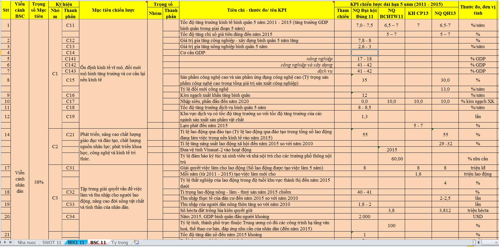 Có được bản đồ chiến lược, thẻ điểm cân bằng với các KPI chiến lược được hình thành. Tôi tiếp tục dựa vào nghị quyết Đại hội Đảng 11, Báo cáo chính trị của Ban Chấp hành Trung ương Đảng khoá trước, nghị quyết BCH Trung ương khóa này, Kế hoạch chính phủ và nghị quyết Quốc hội để nhặt ra các chỉ tiêu (KPI chiến lược) cho bản đồ trên. Kết quả ra bảng như sau: