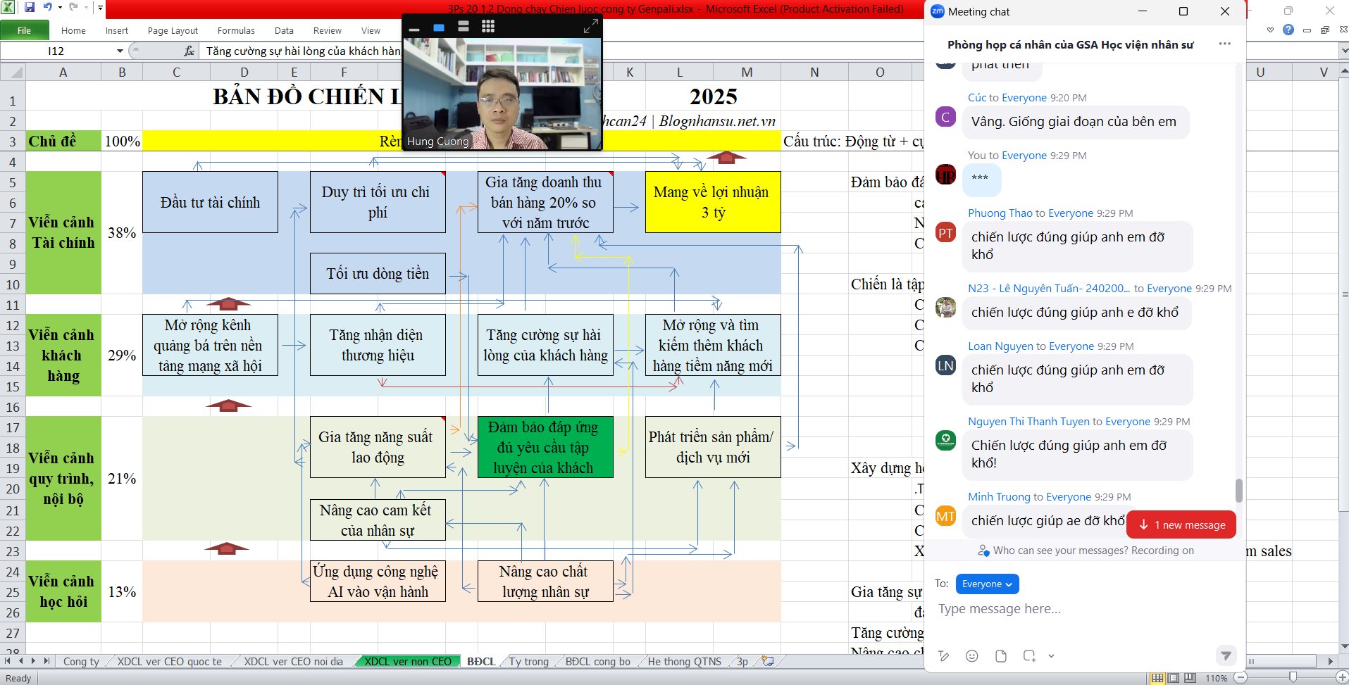 Trả lời: Theo tôi, thực ra công ty nào cũng có mục tiêu và chiến lược. Chỉ có điều chúng ta có biết và tổng hợp được nó hay không mà thôi. Do đó, chúng ta không nên đổi cho lãnh đạo. Là tôi thì tôi sẽ ngồi và trao đổi với các bên, bao gồm trưởng bộ phận và lãnh đạo để làm rõ các dự định và ý tưởng cũng như mục tiêu cần làm trong thời gian tới. Sau khi có ý tưởng rồi thì ngồi và sắp xếp lại các chiến lược vào bản đồ có 4 viễn cảnh Tài chính - Khách hàng - Nội bộ - Phát triển. Sắp xếp xong thì xác nhận lại với lãnh đạo là được.