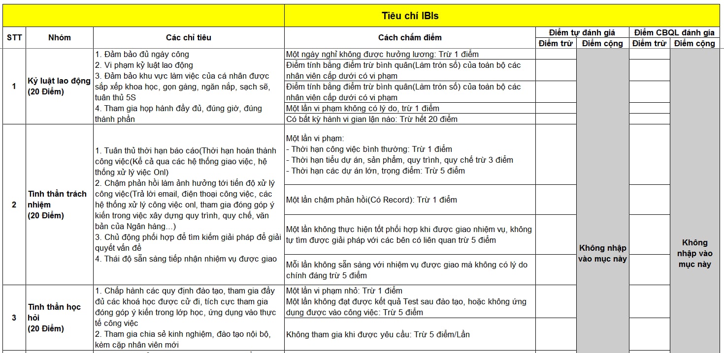 Bước 5: Đưa ra các tiêu chí cộng trừ điểm văn hóa cho từng biểu hiện hành vi (Trả lời câu hỏi như thế nào thì được cộng điểm, như thế nào thì bị trừ điểm)