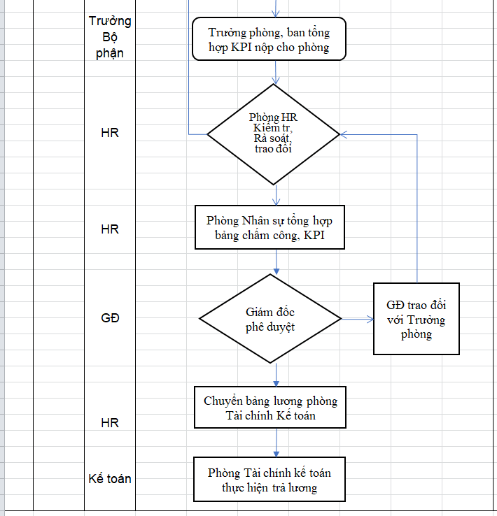 Quy trình đơn giản như sau: Quá nhân tự đánh giá -> Quản lý trực tiếp hậu kiểm -> Quản lý cấp cao hơn hậu kiểm lần 2 -> Phòng Nhân sự hậu kiểm lần 3 -> Kiểm soát nội bộ (nếu có) hậu kiểm xác suất -> Giám đốc hậu kiểm xác suất lần 2.