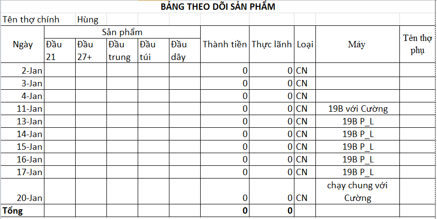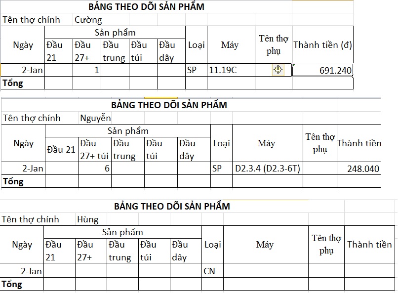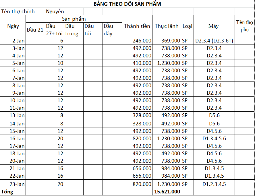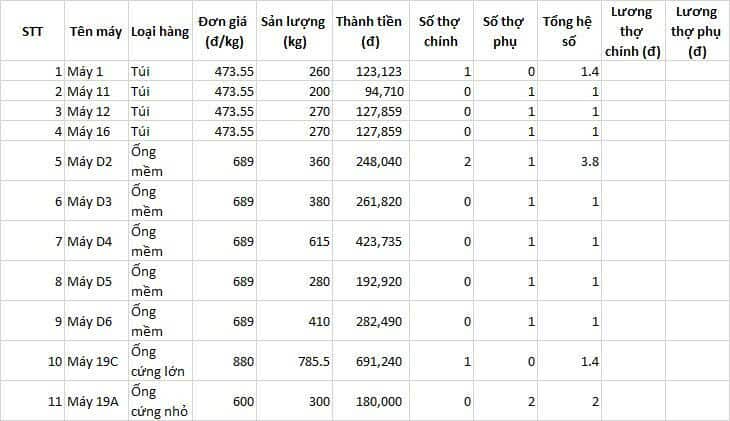 Công ty có nhiều thợ. Mỗi bạn sẽ chạy nhiều đầu máy khác nhau và sẽ có thợ phụ hoặc không có thợ phụ. Thợ phụ chỉ đc tính lương công nhật, thợ chính tính lương theo đầu sản phẩm. Dưới đây là lương tính theo tháng: