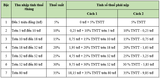- Trong trường hợp nếu ký hợp đồng lao động thì thuế thu nhập sẽ được tính theo thuế lũy tiến và cuối năm quyết toán lại theo bảng như trên.