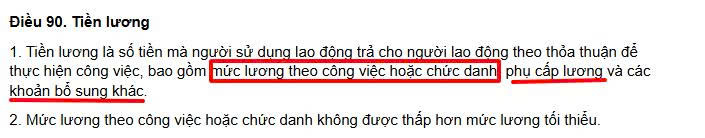 Với câu: "bao gồm mức lương theo công việc hoặc chức danh, phụ cấp lương và các khoản bổ sung khác", tôi không thấy chỗ nào trong thông tư nghị định hay luật quy định một cách cụ thể mức lương theo công việc hoặc chức danh là gì. Do đó trên hợp đồng, quy chế lương có thể ghi định nghĩa cụ thể. Ví dụ: Lương theo công việc là … lương P1 hoặc lương P2 hoặc lương theo vị trí hoặc lương đóng BHXH hoặc lương cơ bản.