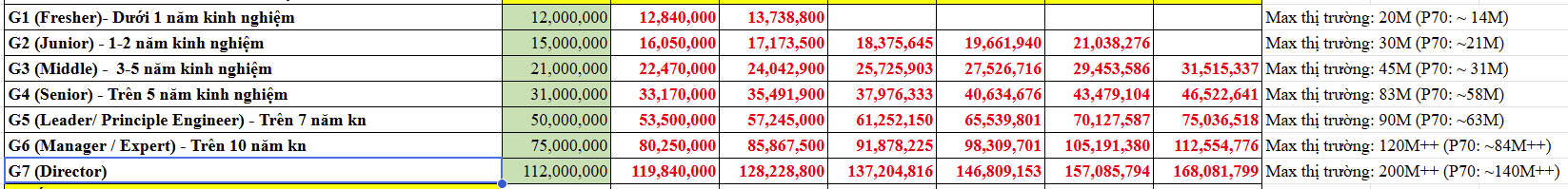 - Với mức tăng 5–7% mỗi bậc, kể cả đi hết các bậc trong Grade thì mức lương tối đa vẫn chưa thực sự cạnh tranh, đặc biệt với nhóm Tech.