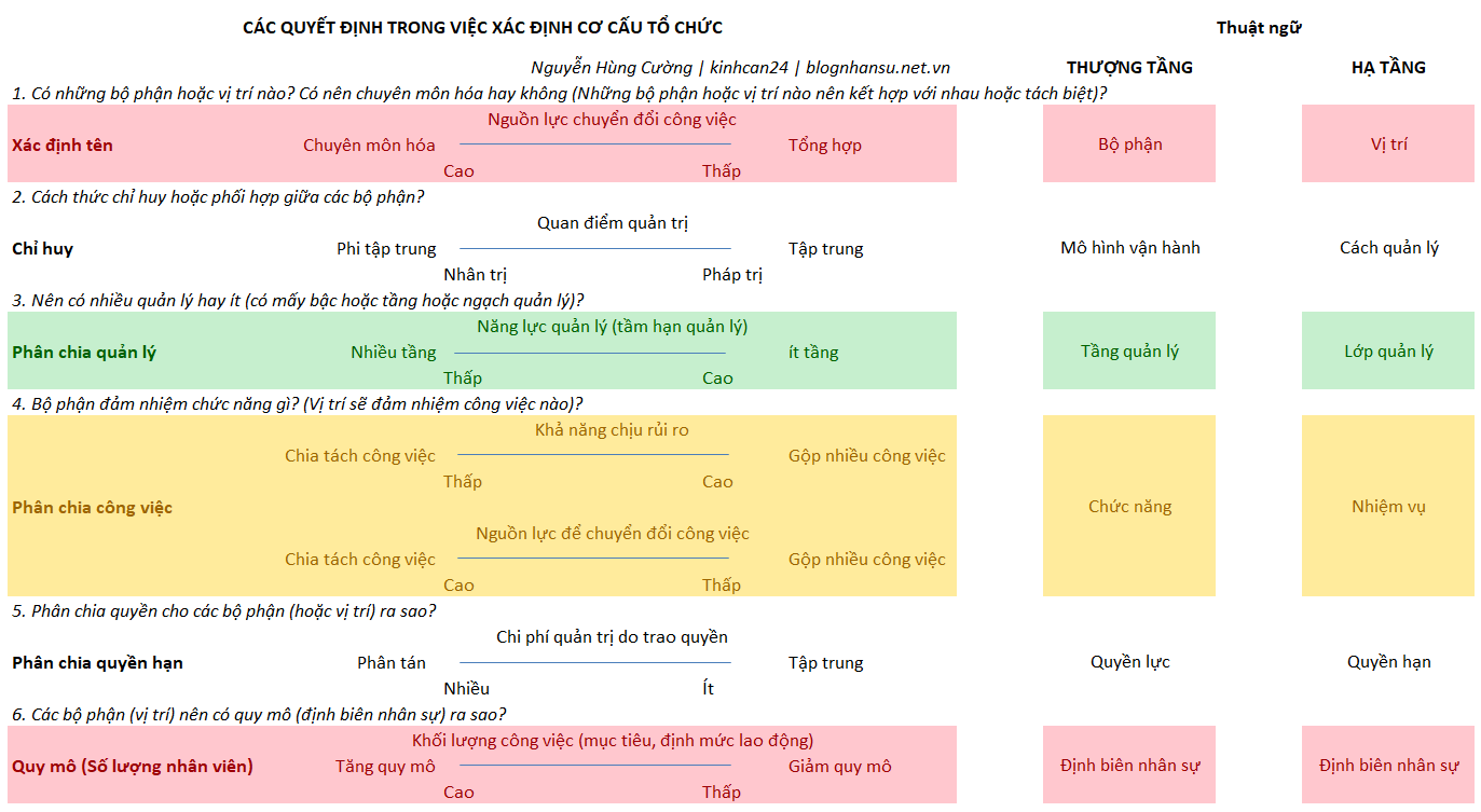Là nhà quản trị, quyết định đầu tiên trong hành trình xác định cơ cấu đó là xác định bộ phận (hoặc vị trí) và tách nhập chúng. Để ra quyết định, chúng ta sẽ cân nhắc 4 yếu tố: