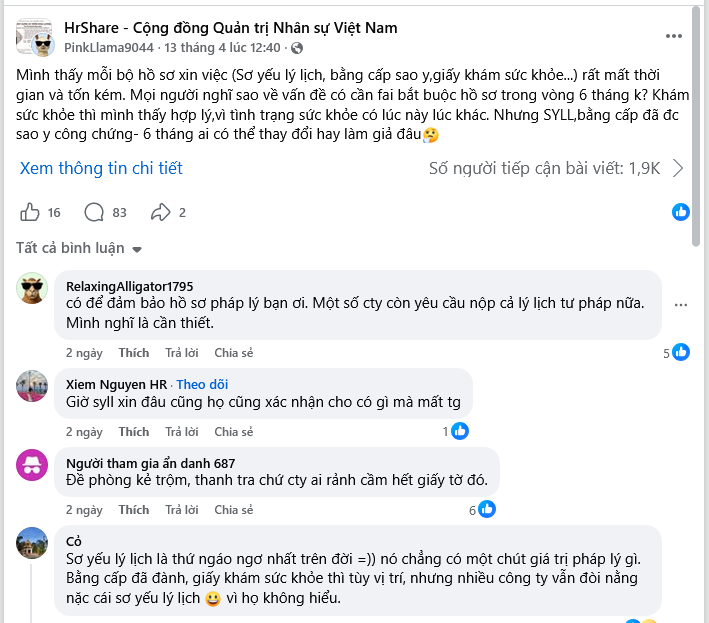 Cỏ: Sơ yếu lý lịch là thứ ngáo ngơ nhất trên đời =)) nó chẳng có một chút giá trị pháp lý gì. Bằng cấp đã đành, giấy khám sức khỏe thì tùy vị trí, nhưng nhiều công ty vẫn đòi nằng nặc cái sơ yếu lý lịch 😃 vì họ không hiểu.