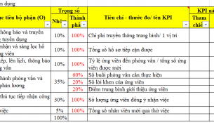 Hỏi: "Ac nào có file KPI bên tuyển dụng cho e xin tham khảo v ạ?" Trả lời: 1. Để trả lời, đầu tiên phải xác định mô tả công việc của vị trí tuyển dụng có nội dung là gì? TRÁCH NHIỆM VÀ NHIỆM VỤ PHẢI ...